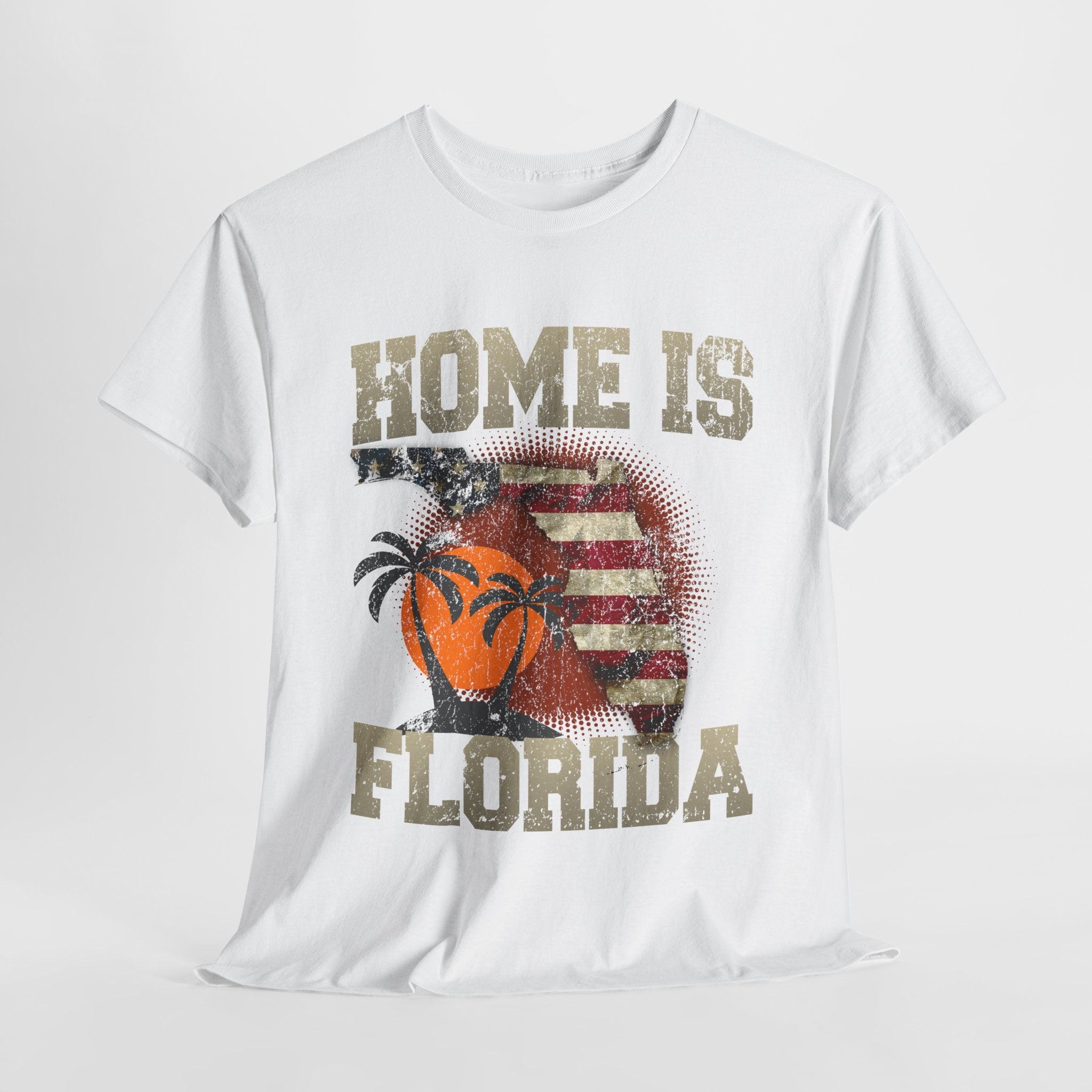 This Unisex Heavy Cotton Tee is your go-to shirt for comfort and style, perfect for everyday wear. Show your love for the Sunshine State with this “Home Is Florida” t-shirt. Featuring a distressed American flag inside the Florida state outline with palm trees and a warm sunset design, this tee is perfect for Florida natives, snowbirds, and vacationers alike. Made from soft, breathable cotton for everyday comfort, it’s great for beach trips, casual wear, or as a thoughtful gift for anyone who calls Florida home.