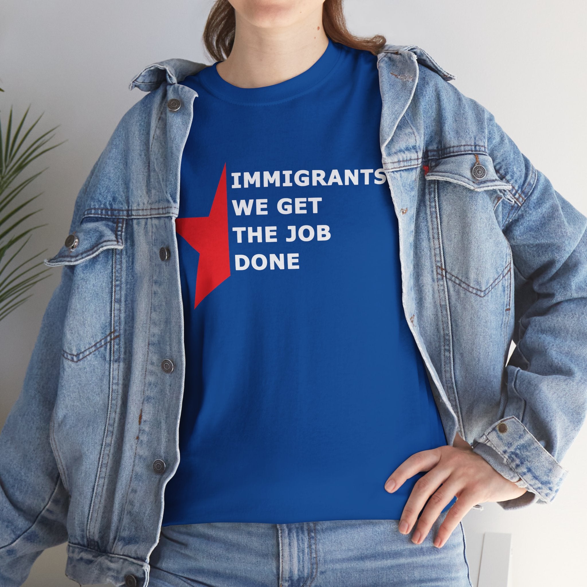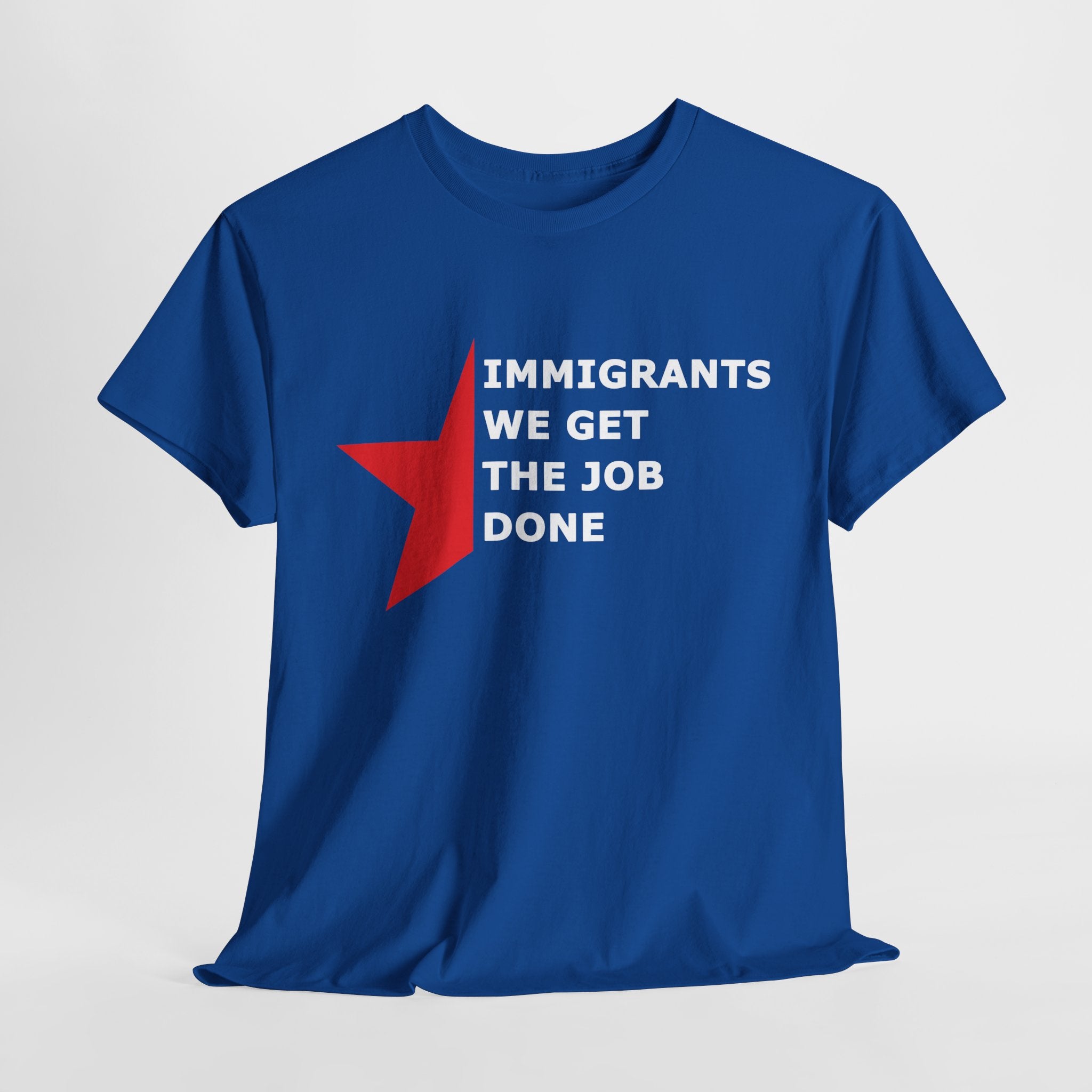 Introducing our Unisex Heavy Cotton Tee, a versatile wardrobe staple designed for comfort and style. Celebrate resilience and representation with this powerful "Immigrants: We Get the Job Done" T-shirt. Inspired by the iconic line from the hit musical Hamilton, this blue tee features bold white text and a red star for added flair. Perfect for fans of the show, advocates of immigrant rights, and anyone who believes in the strength of diversity. Wear it proudly to spark conversation and show solidarity.